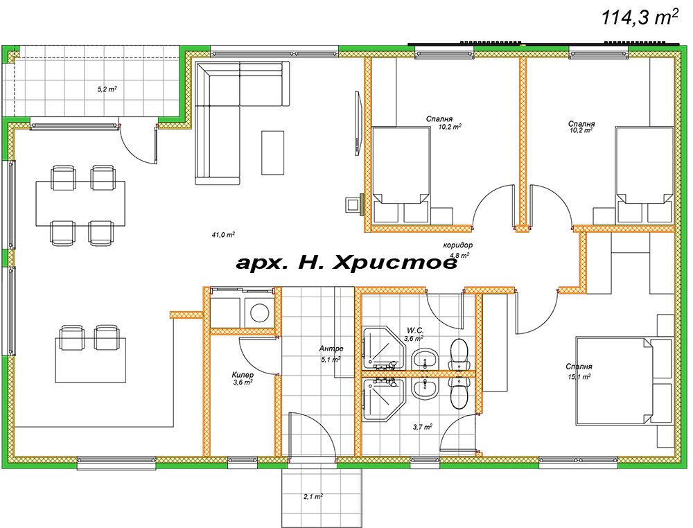 Просторна едноетажна къща с РЗП 114 кв.м. Разполага с входно антре, всекидневна с кухненски бокс, 3 спални, 2 бани, склад и покрита веранда. Проектът предлага комфортна жилищна среда с ясно обособени зони за почивка и ежедневие.